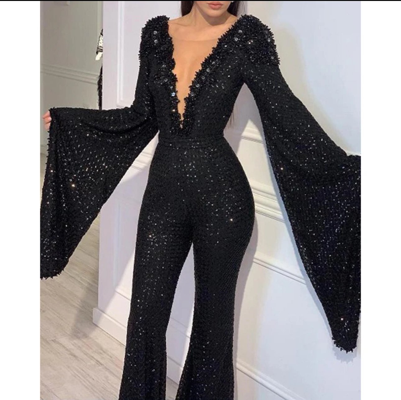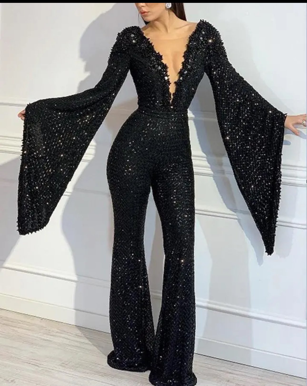 Turn heads in this show-stopping black sequin jumpsuit designed for unforgettable nights. Featuring a dramatic deep V neckline and statement bell sleeves, this piece combines elegance with bold glamour. The figure-hugging silhouette sparkles from every angle, while the flared legs elongate the body for a sleek, confident look. Perfect for parties, special events, or any moment you want to shine.