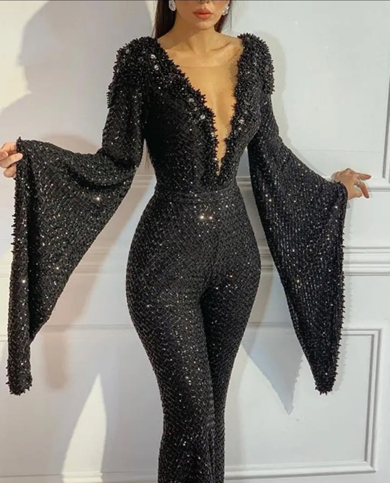 Black Sequin Deep V Bell-Sleeve Jumpsuit