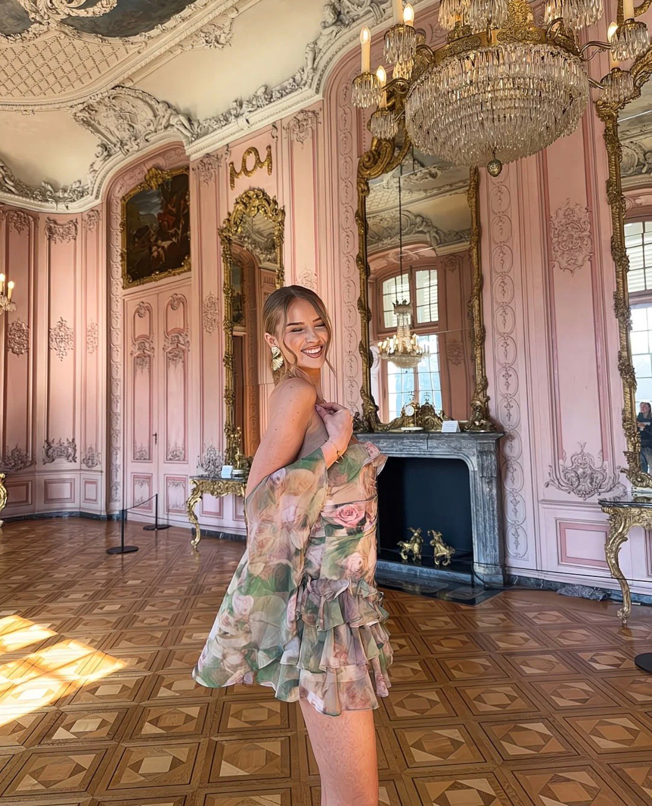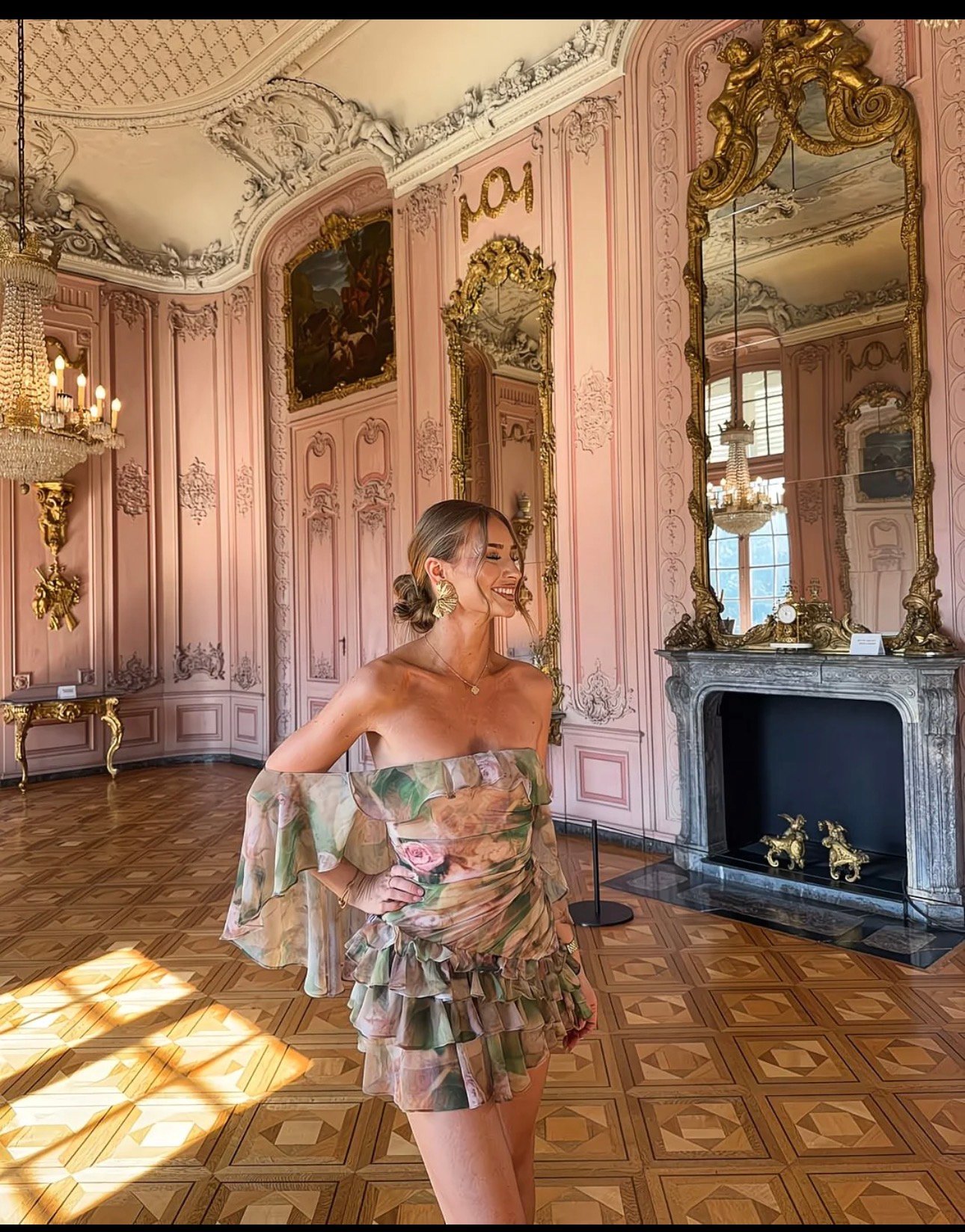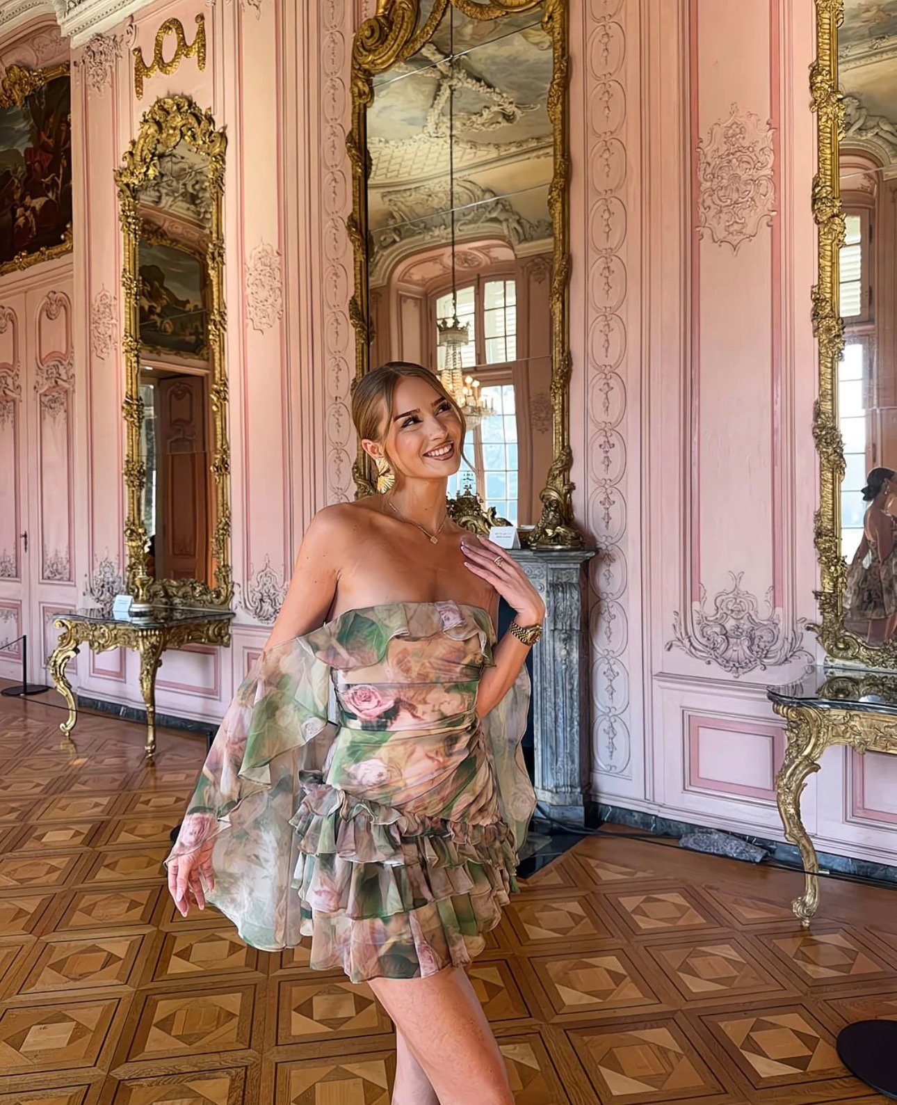 A whisper of romance captured in motion—this floral chiffon dress floats effortlessly through a gilded Rococo salon. Soft blush tones and painterly blooms echo the ornate pink walls and crystal chandeliers, while delicate ruffles add a playful, modern sway. Equal parts fairytale and finesse, it’s a look made for grand rooms, golden light, and moments that feel suspended in time.