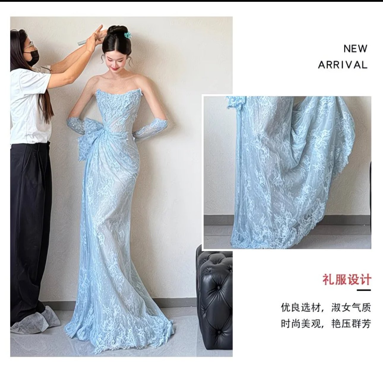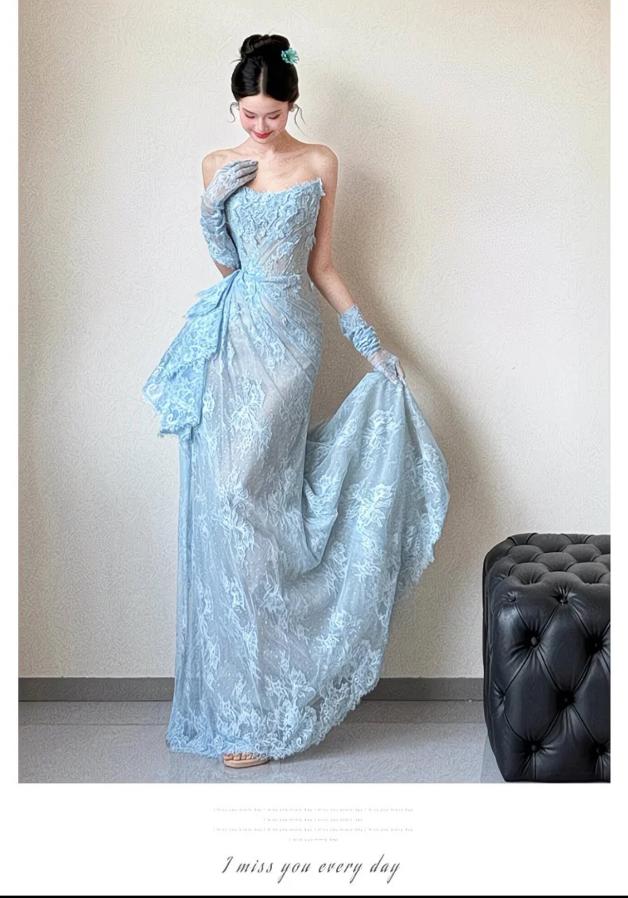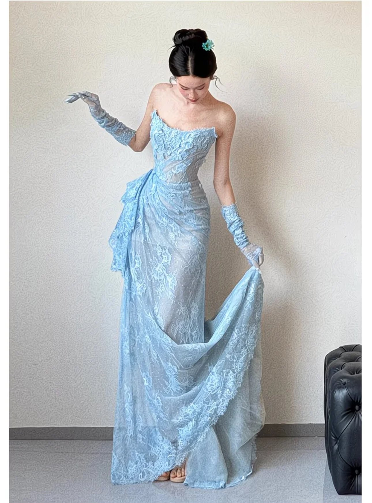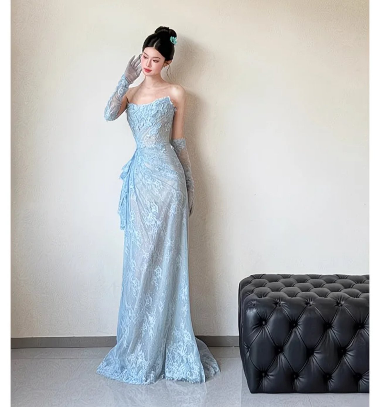 A vision of icy romance, the Celeste Frost Elegance Gown is crafted in delicate sky-blue lace that drapes effortlessly into a sleek, floor-length silhouette. The softly structured bodice highlights the neckline with subtle texture, while the asymmetrical lace detailing at the waist adds a graceful, couture-inspired touch. Paired with matching lace gloves, this gown exudes refined glamour—perfect for evening galas, formal soirées, or moments that call for quiet sophistication and timeless beauty.