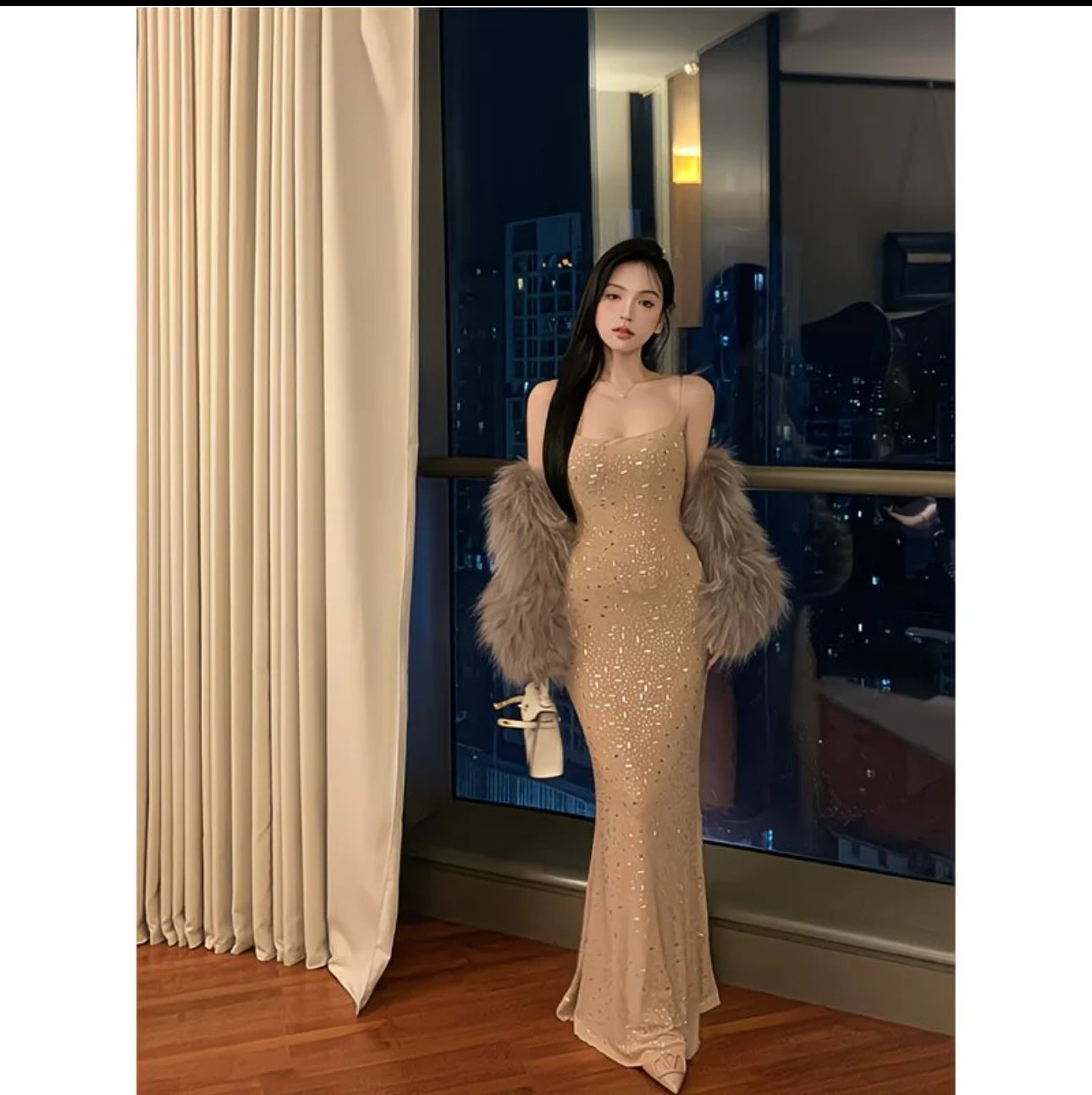 An ode to after-dark elegance, this champagne-toned gown glides over the body with a sleek, figure-hugging silhouette. Delicate shimmer detailing catches the light like scattered stardust, while slender spaghetti straps and a softly contoured neckline add refined allure. Finished with a fluid hem that skims the floor, this dress is designed for nights that call for quiet luxury—perfect for galas, soirées, or candlelit city evenings.