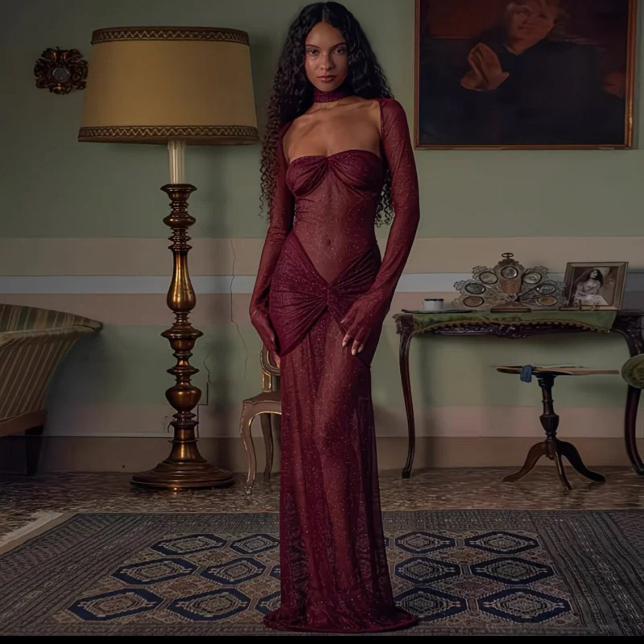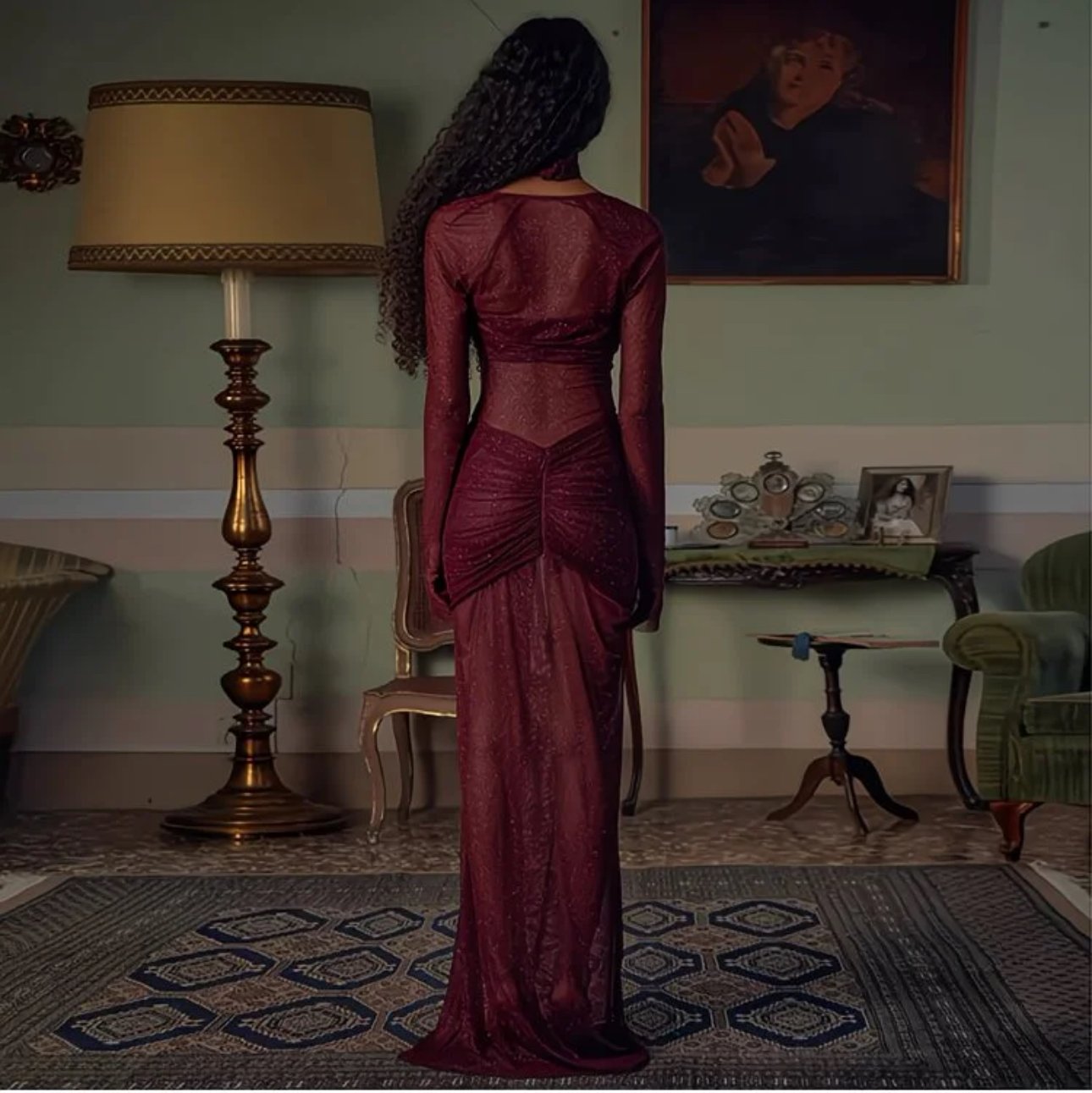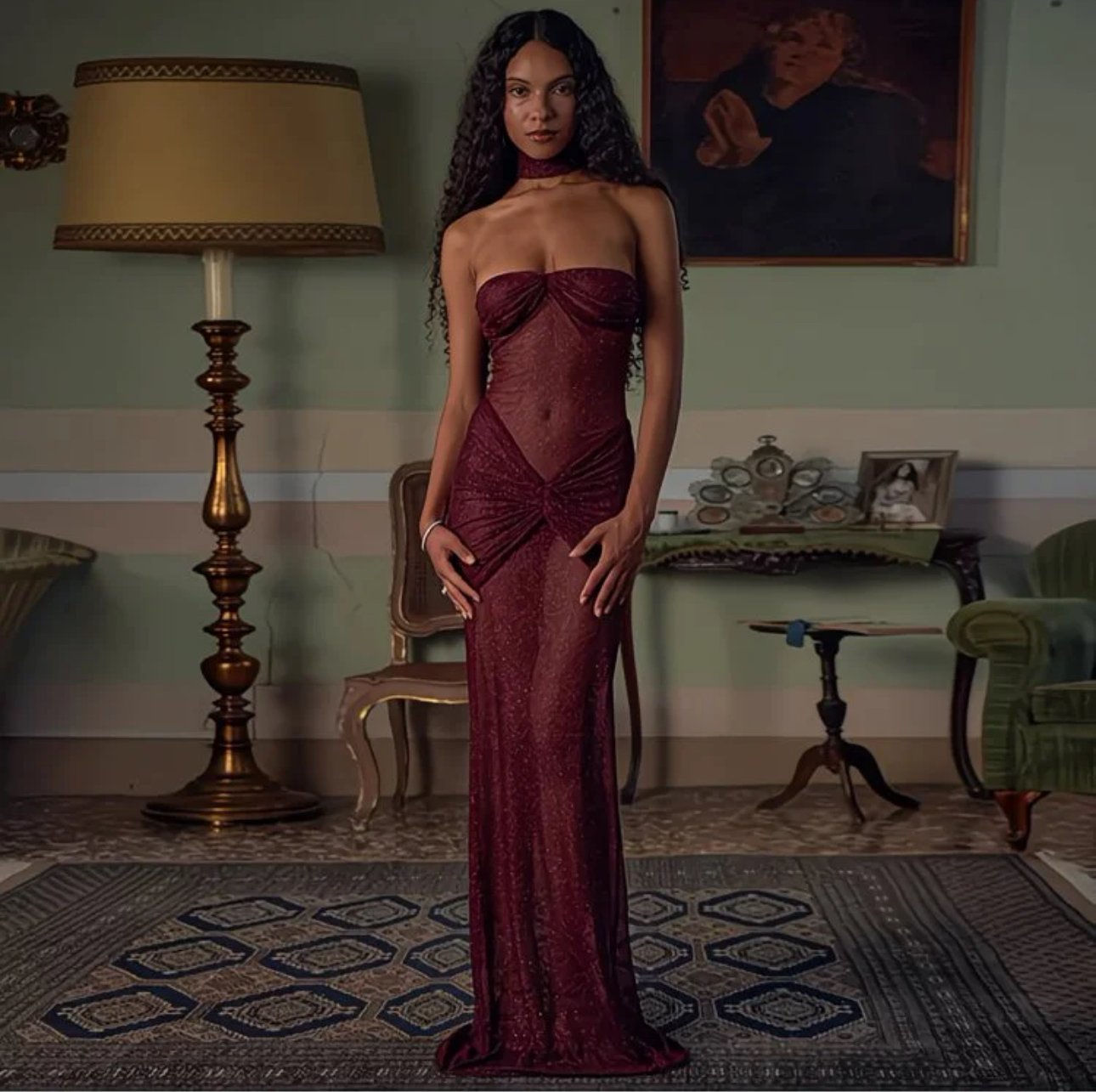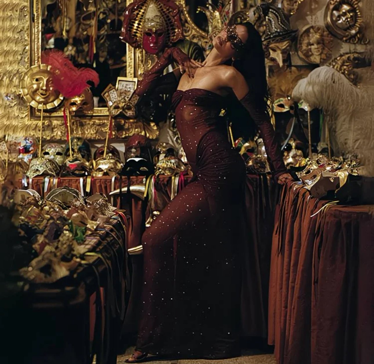 Draped in deep burgundy lace, this silhouette feels like a whispered secret from another era. The sculpted bodice and fluid drape celebrate quiet confidence, while the vintage interior sets a timeless, almost cinematic mood. Elegant yet daring, it’s a look that blurs the line between classic romance and modern allure—made to linger in memory long after the moment passes.