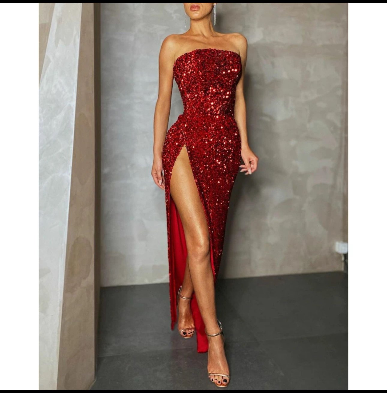 Turn every head in the room with this jaw-dropping strapless gown, drenched in rich crimson sequins that catch the light from every angle. The sculpted, corset-style bodice hugs the figure beautifully, flowing into a sleek skirt with a daring thigh-high slit for just the right dose of drama. Elegant, bold, and unapologetically glamorous, this dress is made for red-carpet moments, black-tie events, and nights when subtle simply won’t do. ✨🔥