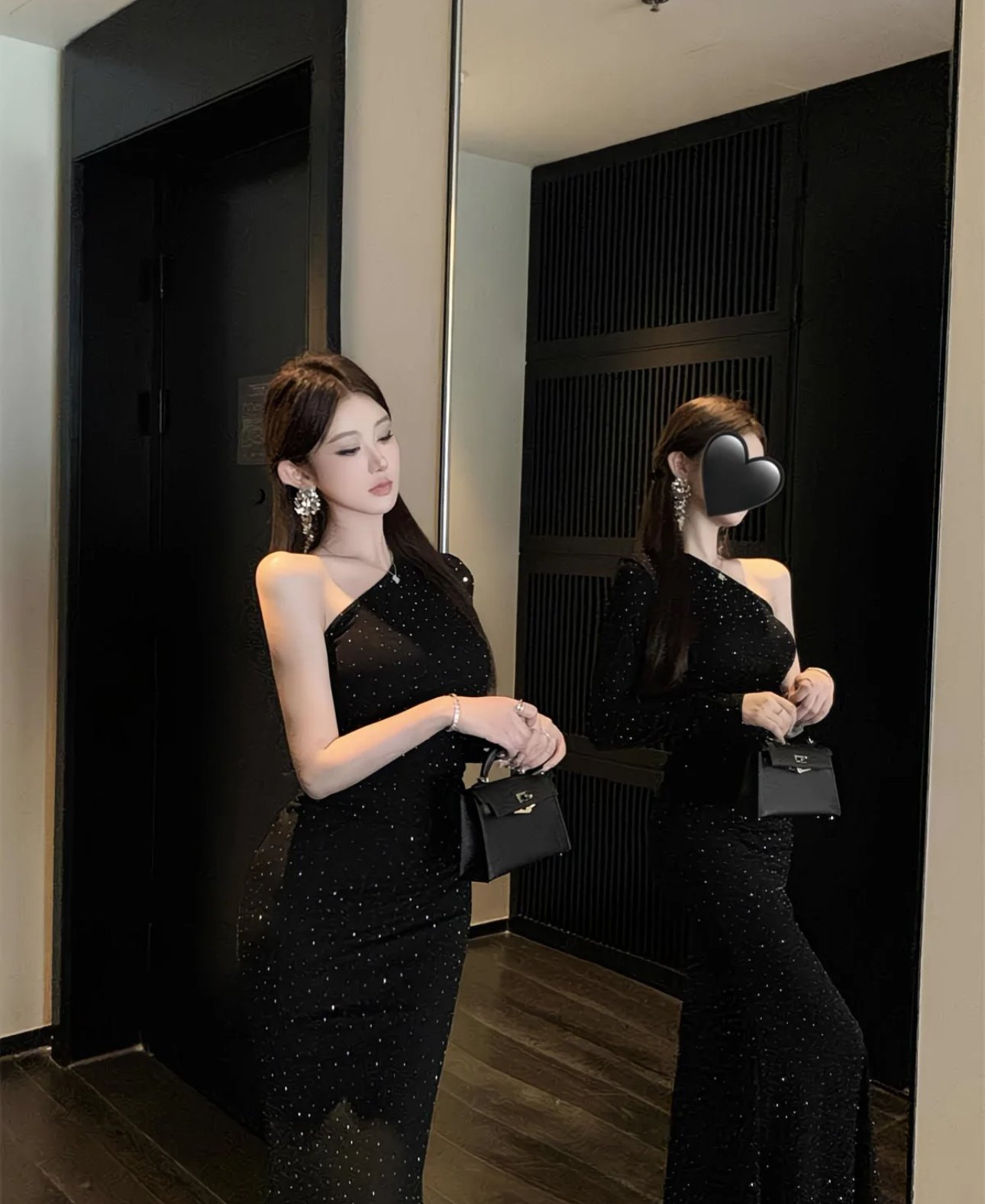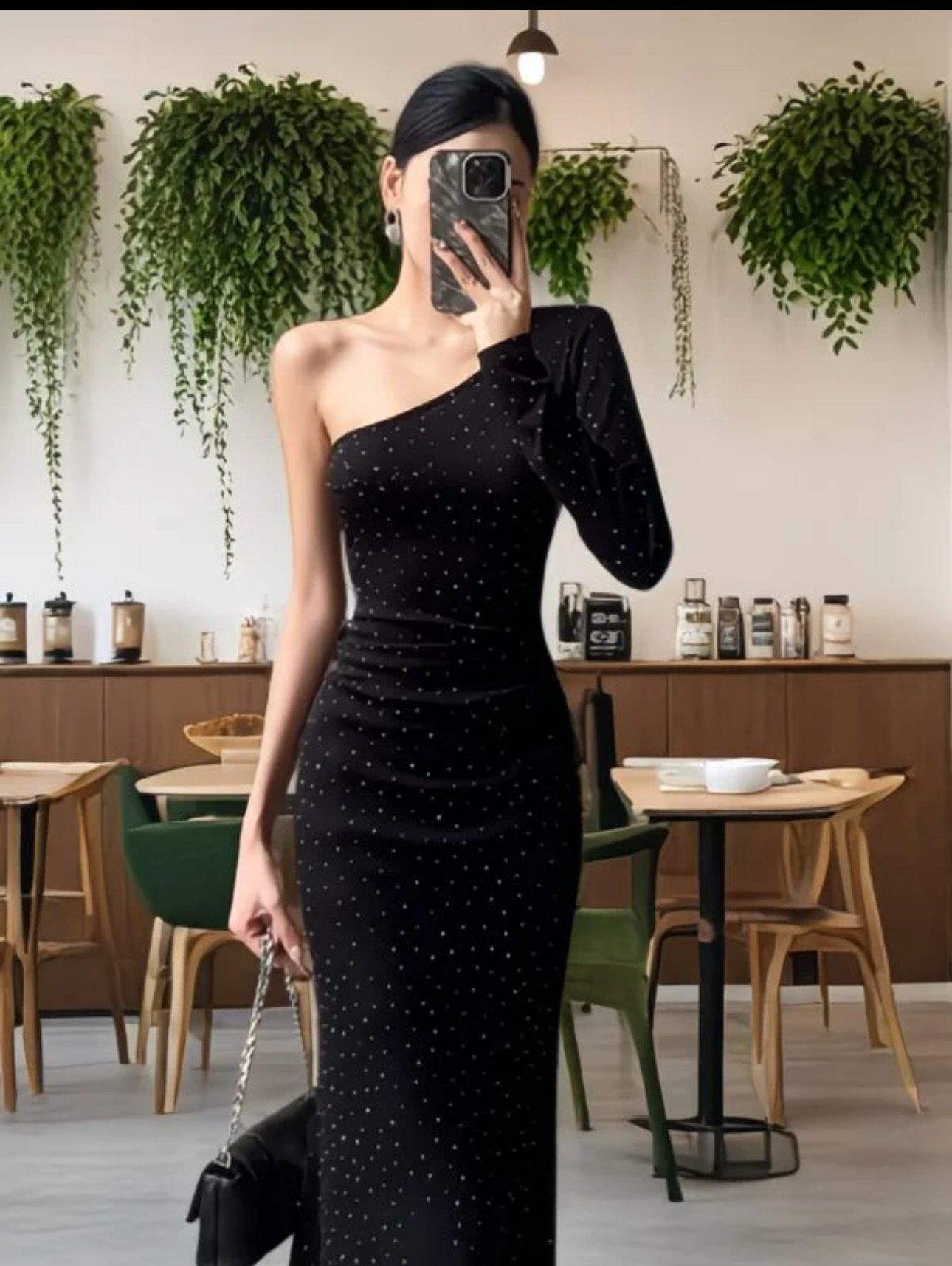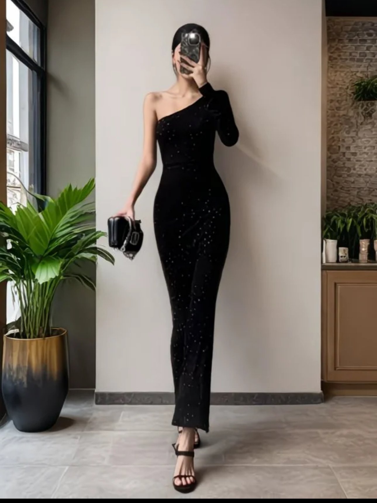 A sleek ode to modern glamour, the Midnight Starlight Gown is designed to turn every entrance into a moment. Crafted in a sculpting black silhouette, this one-shoulder dress glides effortlessly along the body, subtly flaring at the hem for graceful movement. Delicate, star-like embellishments shimmer across the fabric, catching the light with every step. Elegant yet daring, it’s the perfect choice for evening soirées, cocktail nights, or any occasion that calls for understated drama and timeless allure. ✨🖤