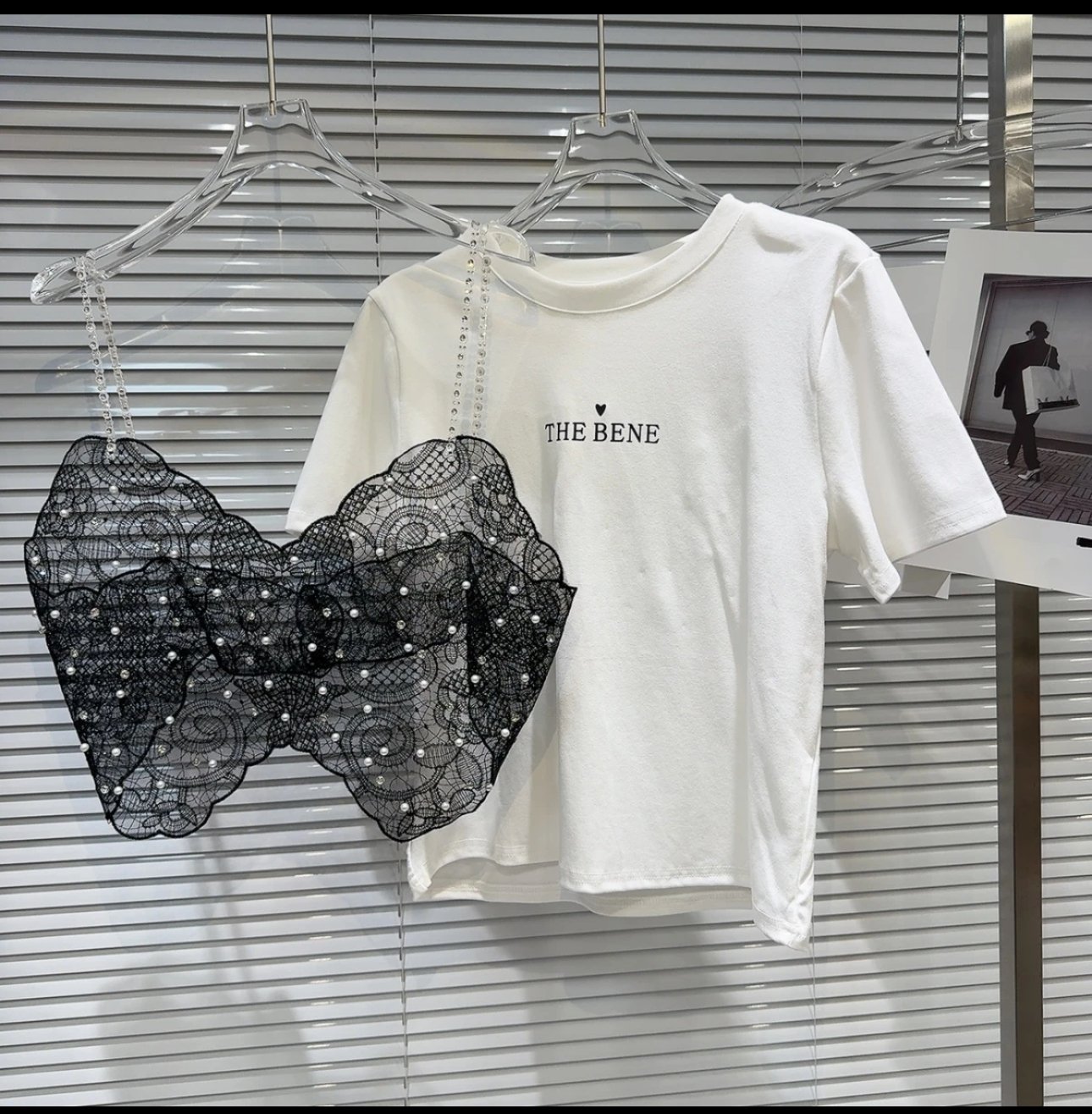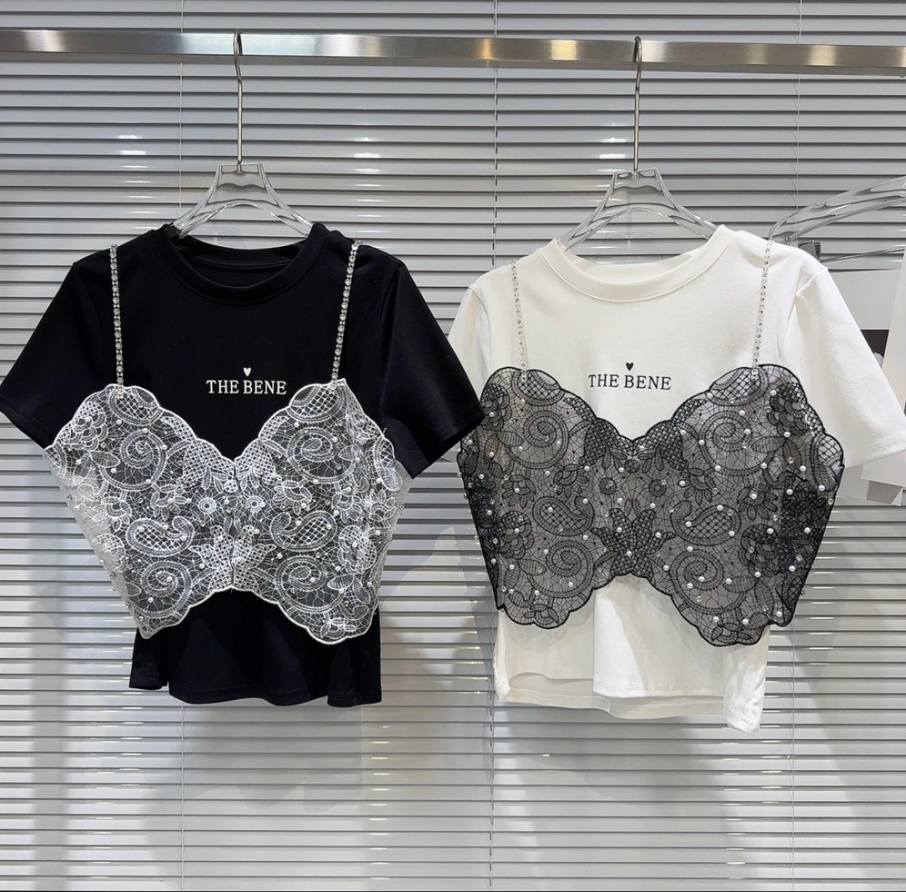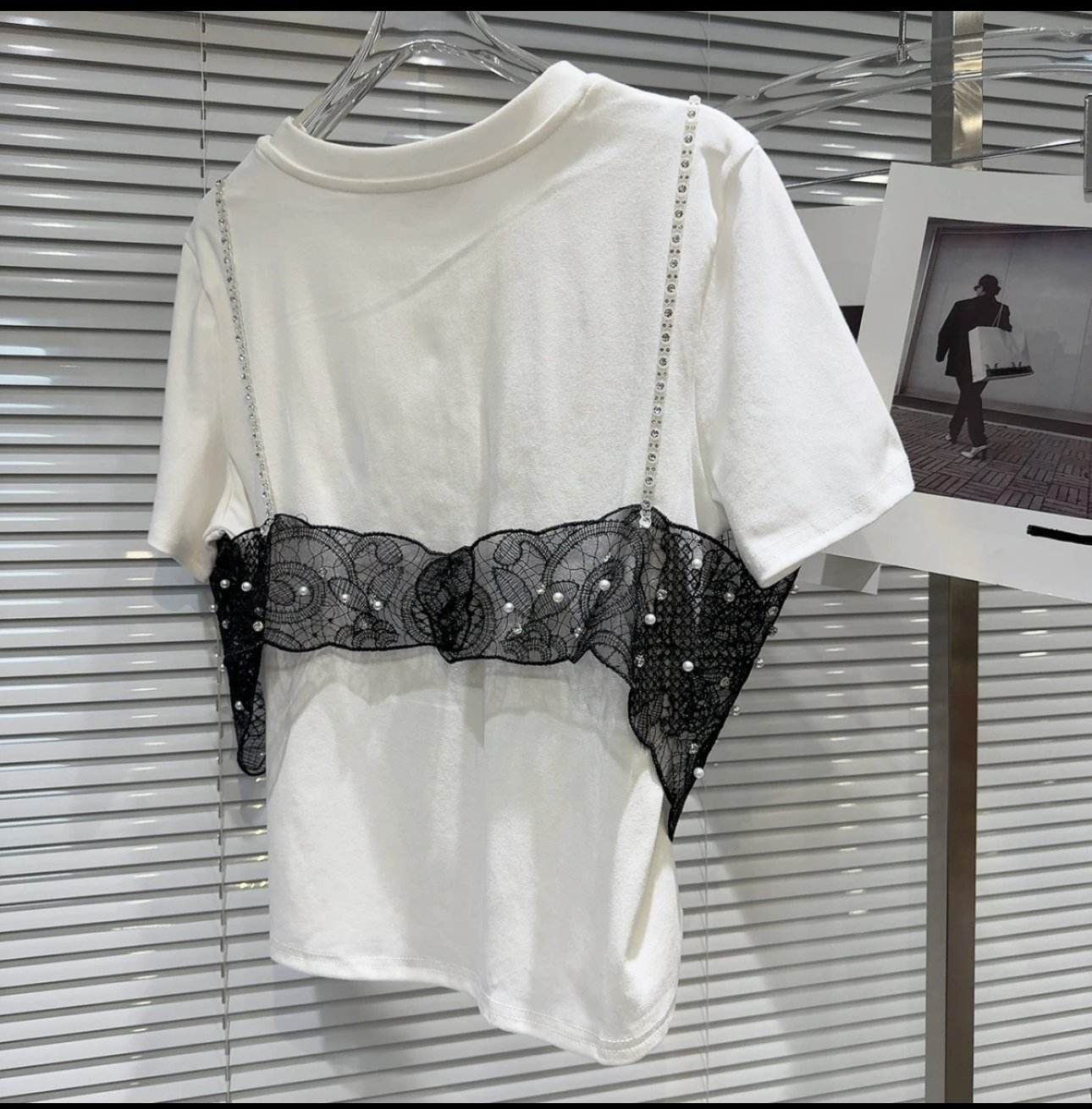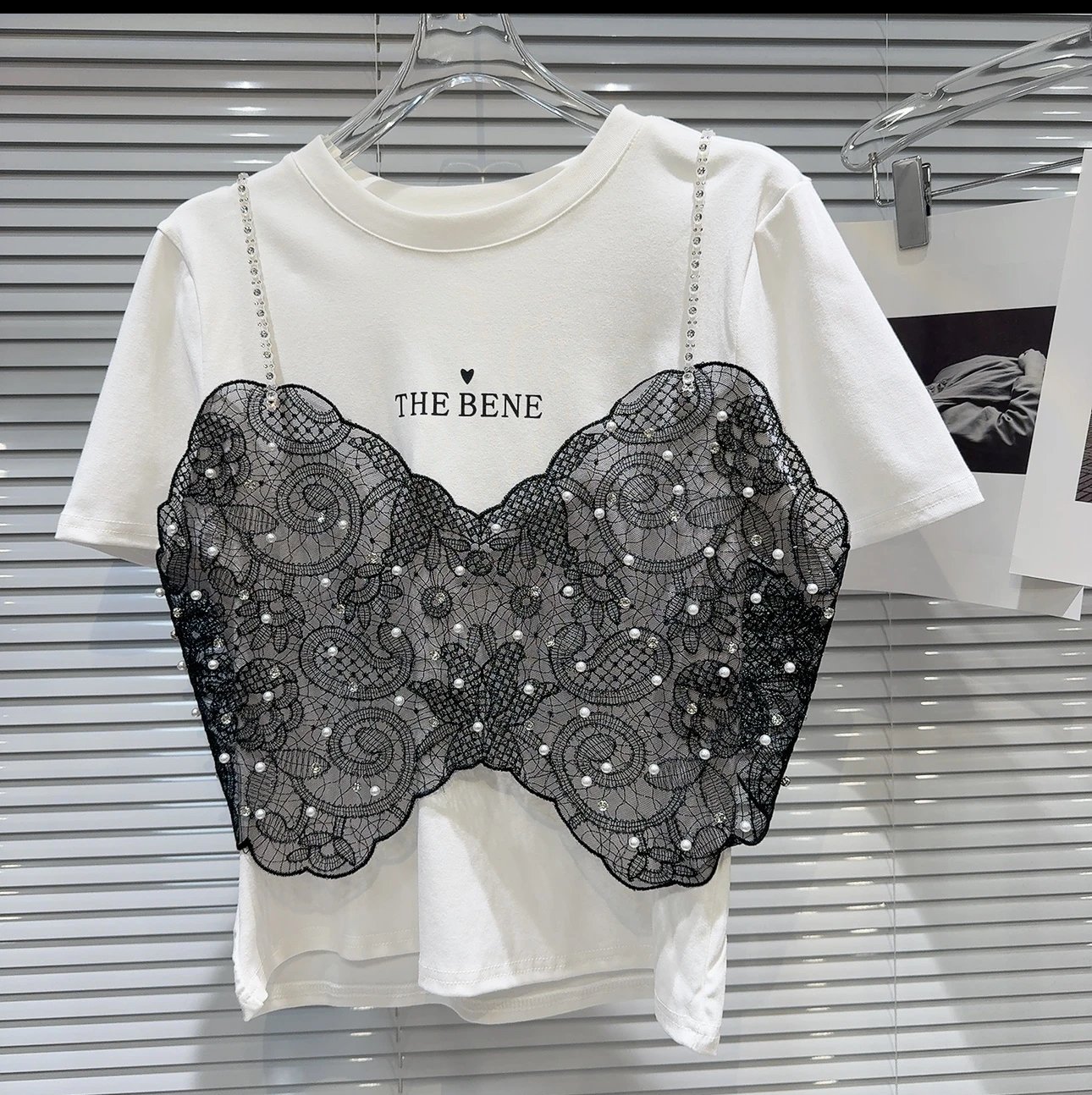 A chic fusion of edgy and elegant, this white statement tee features a stunning black lace corset overlay adorned with delicate pearl embellishments. Designed with rhinestone strap details and intricate floral lace patterns, it creates a layered illusion that blends romantic charm with modern street style. Soft, comfortable, and effortlessly eye-catching — perfect for dressing up your denim or styling with a sleek skirt for a bold fashion moment.