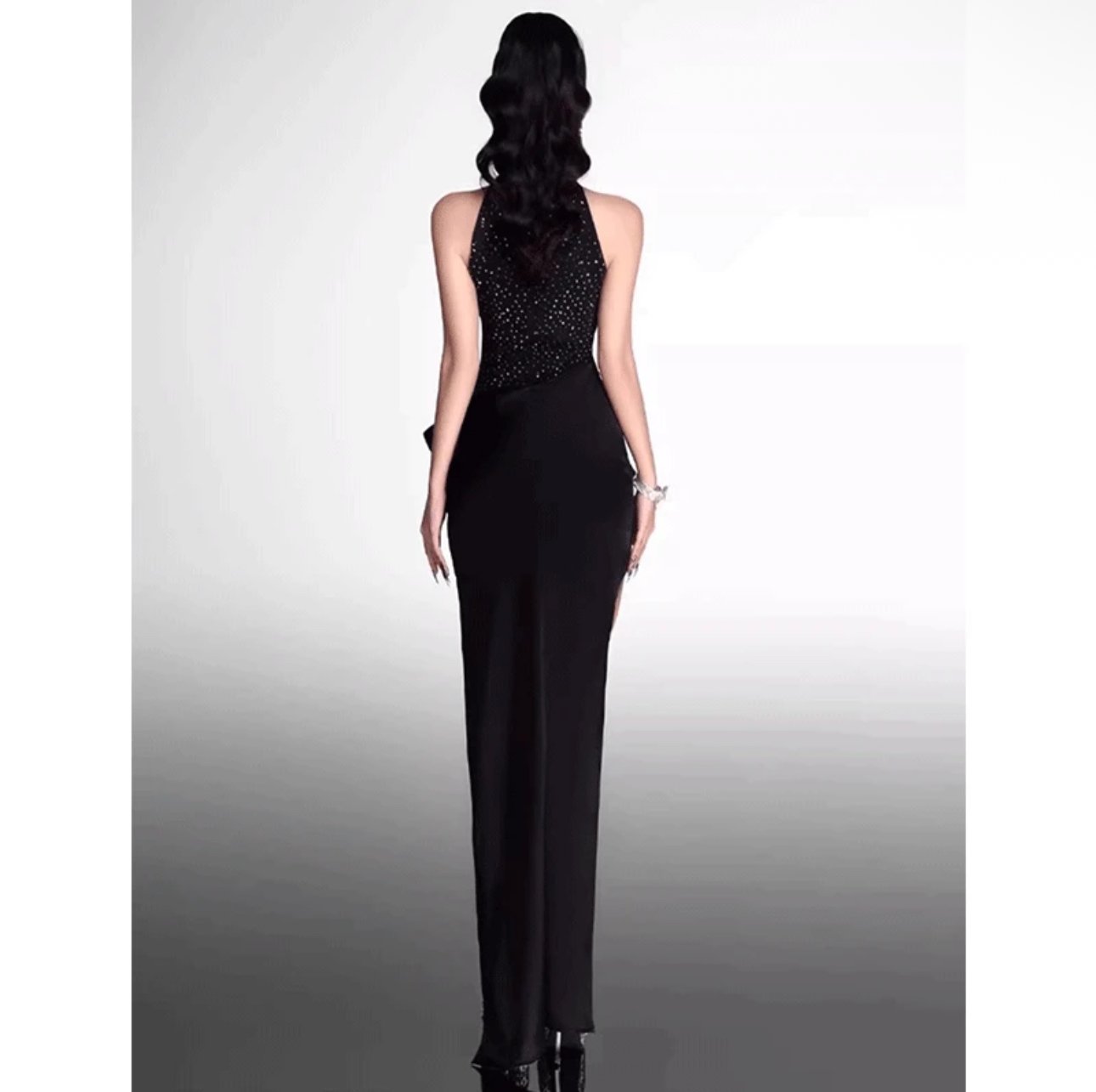A striking fusion of glamour and edge, this black halter dress glistens with subtle starlike embellishments that catch the light with every move. The sculpted silhouette flows into an asymmetrical draped skirt, accented by a dramatic floral detail and a sleek cascading panel for added allure. Elegant yet bold, it’s a statement piece made for midnight soirées, cocktail evenings, and moments that demand unforgettable confidence.