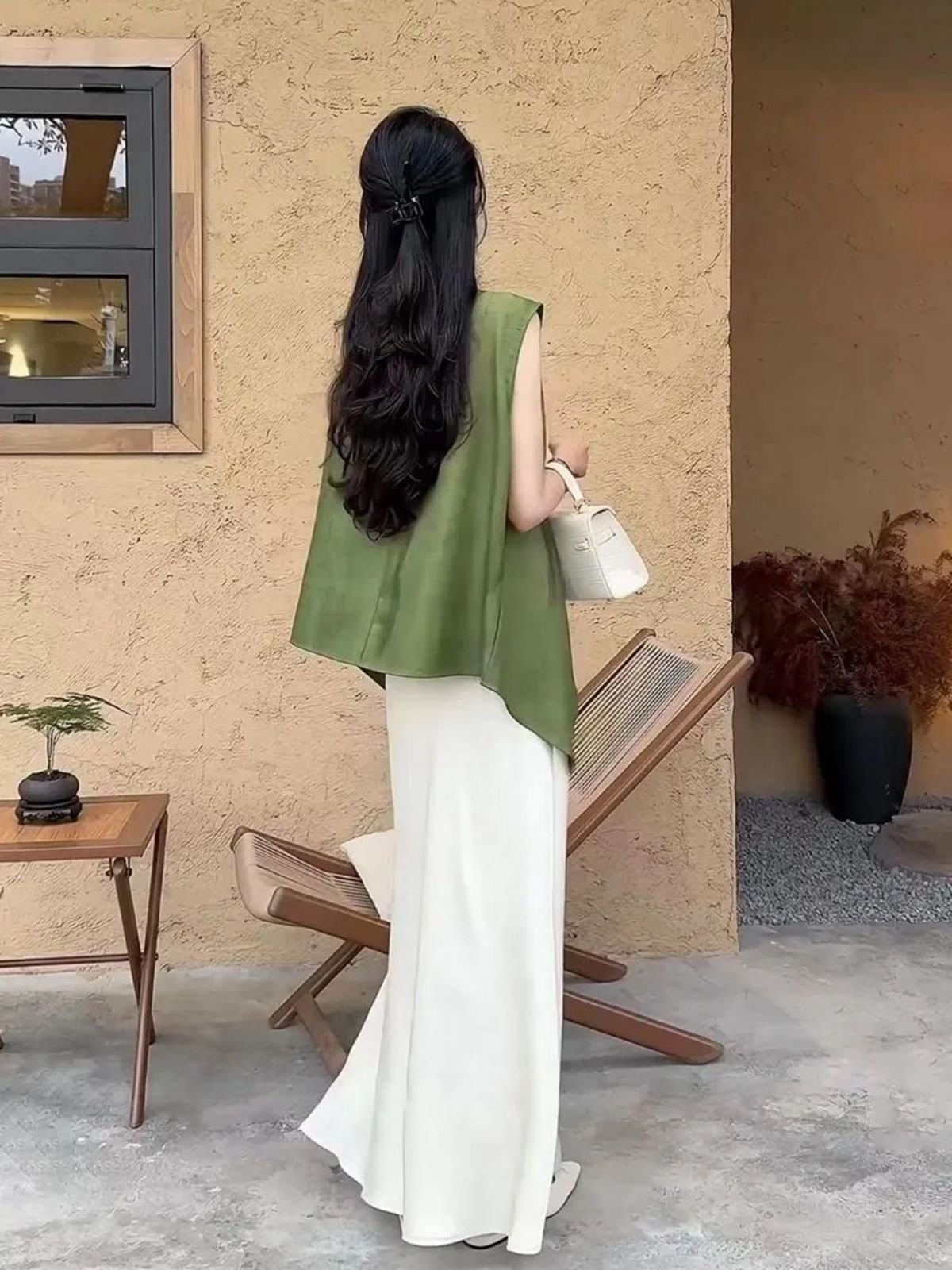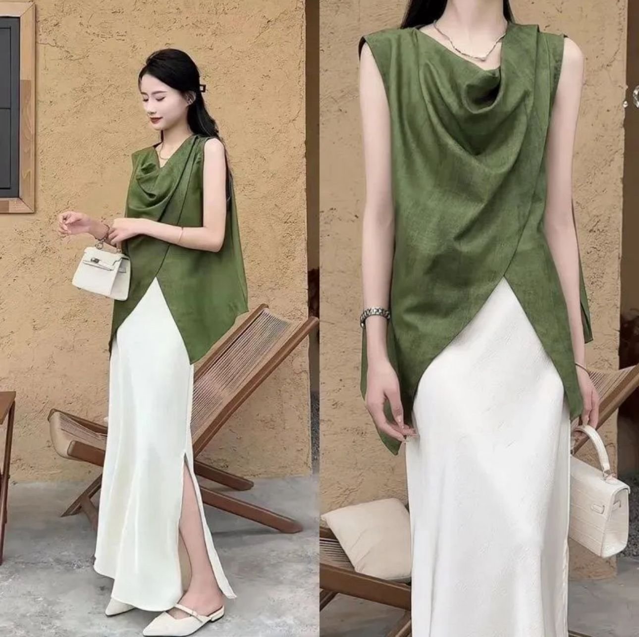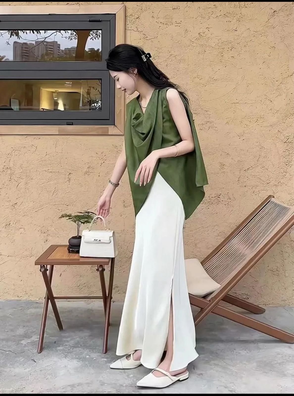 Channel effortless elegance with this Olive Green Drape Top and White Maxi Skirt Set, a refined choice for brunch dates, art gallery outings, or summer evenings. The asymmetric draped top features a relaxed cowl neckline and sleeveless silhouette, cascading into an artful cape-like shape. It’s paired with a high-waisted, flowy ivory skirt featuring a sleek side slit for graceful movement and subtle allure.