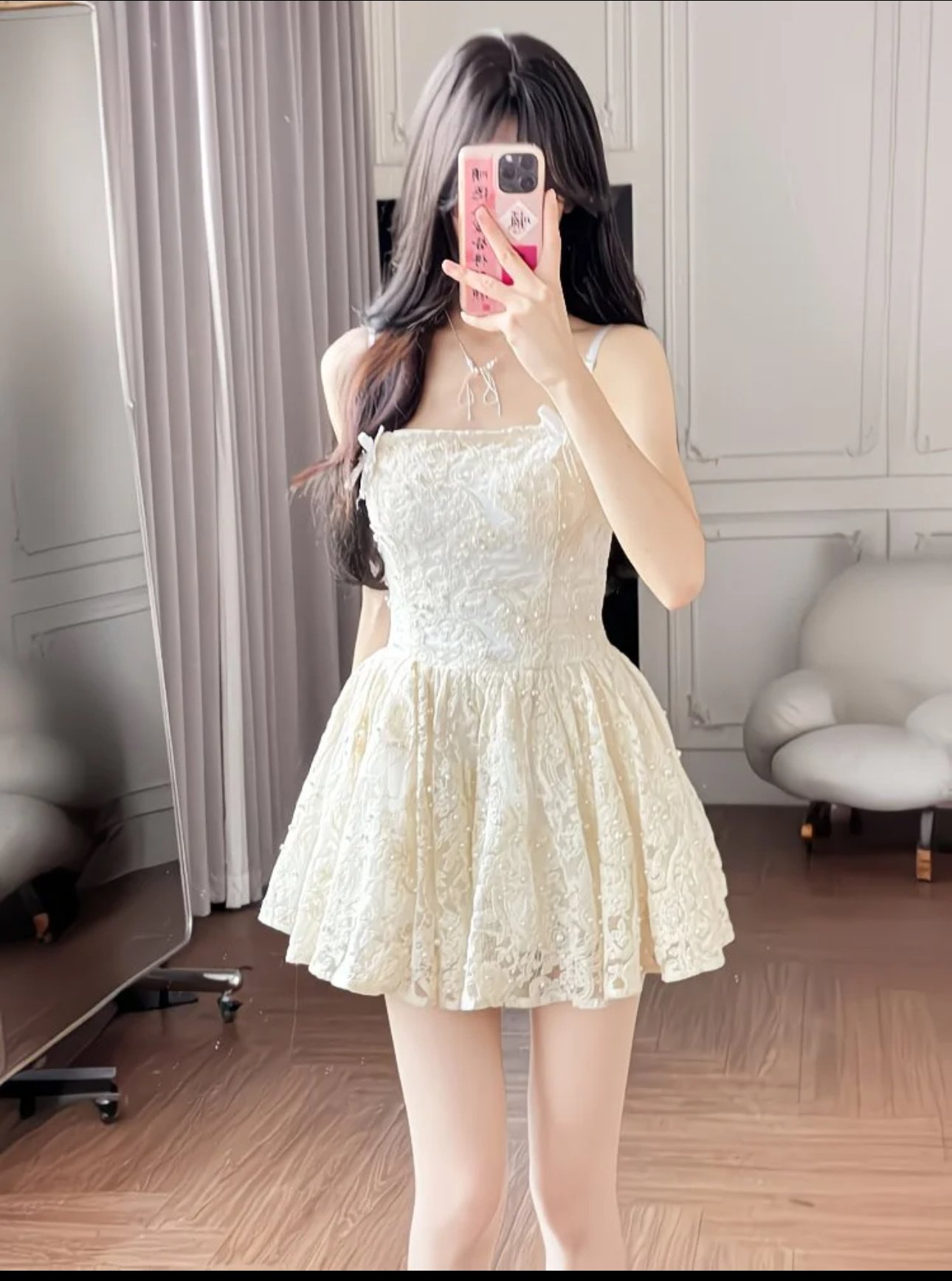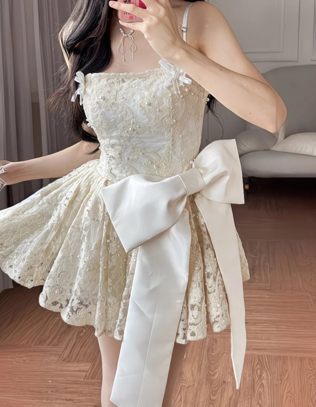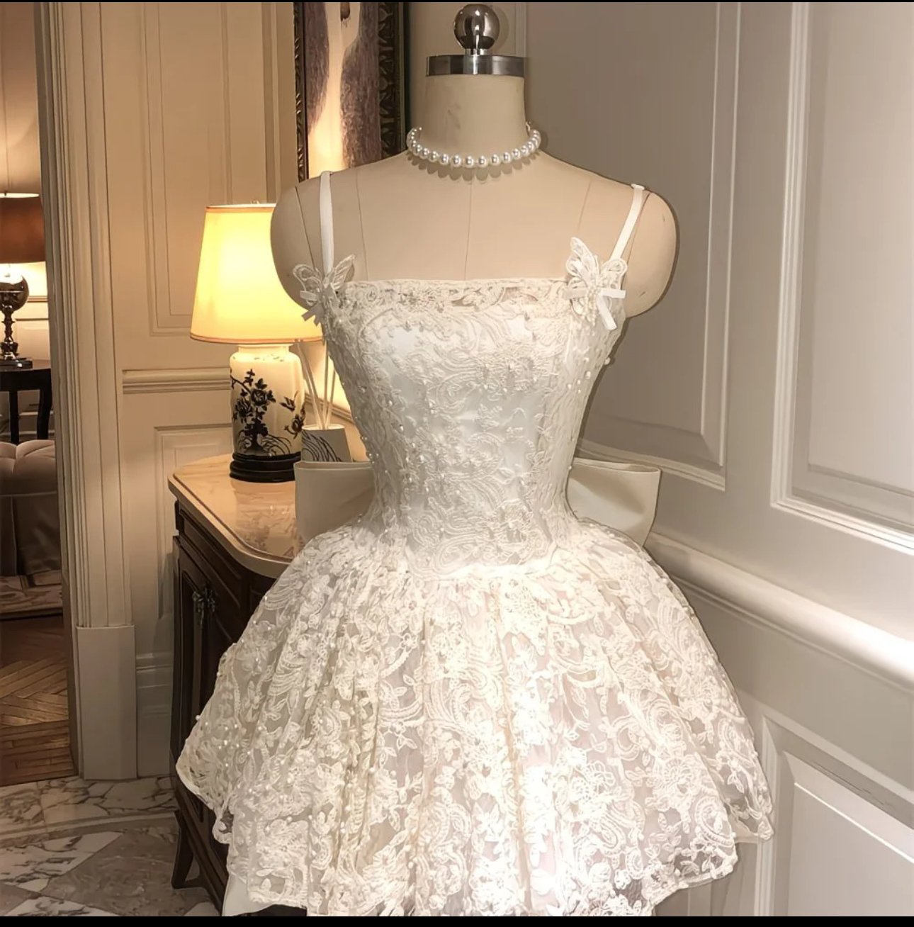 An enchanting blend of romance and refinement, this ivory lace dress is crafted with a sculpted corset bodice that defines the waist and flatters the silhouette. Delicate floral lace overlays the entire design, while soft pearl accents add a subtle, luminous touch. The airy, flared skirt brings a graceful finish, balancing structure with softness. Finished with slender straps adorned by dainty butterfly appliqués, this dress feels effortlessly feminine—perfect for bridal soirées, engagement celebrations, or any moment that calls for timeless elegance with a whisper of whimsy.