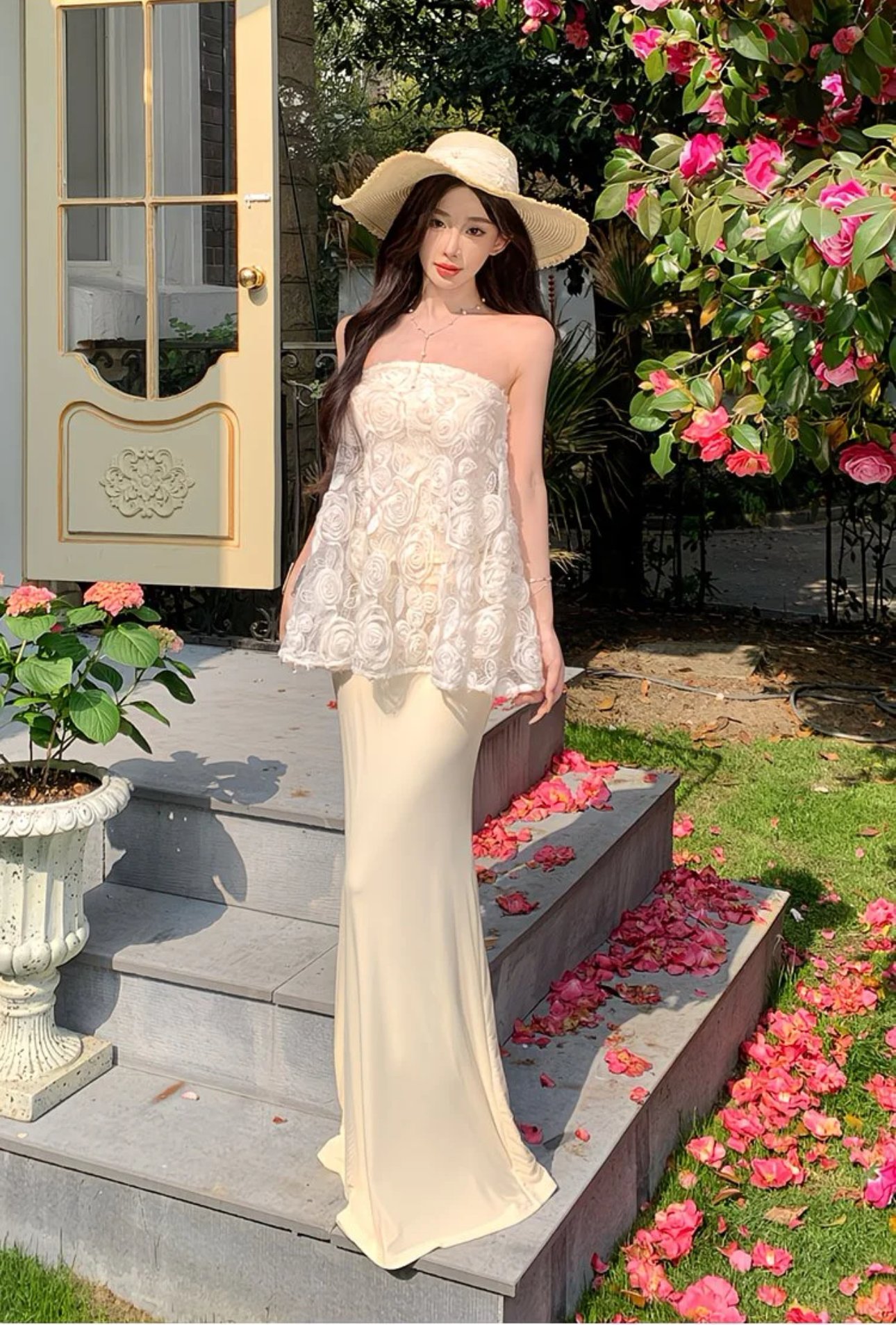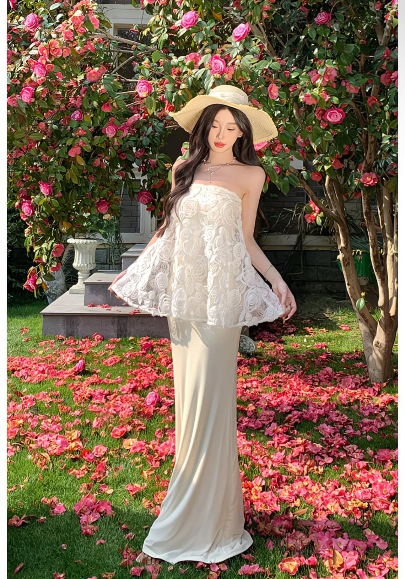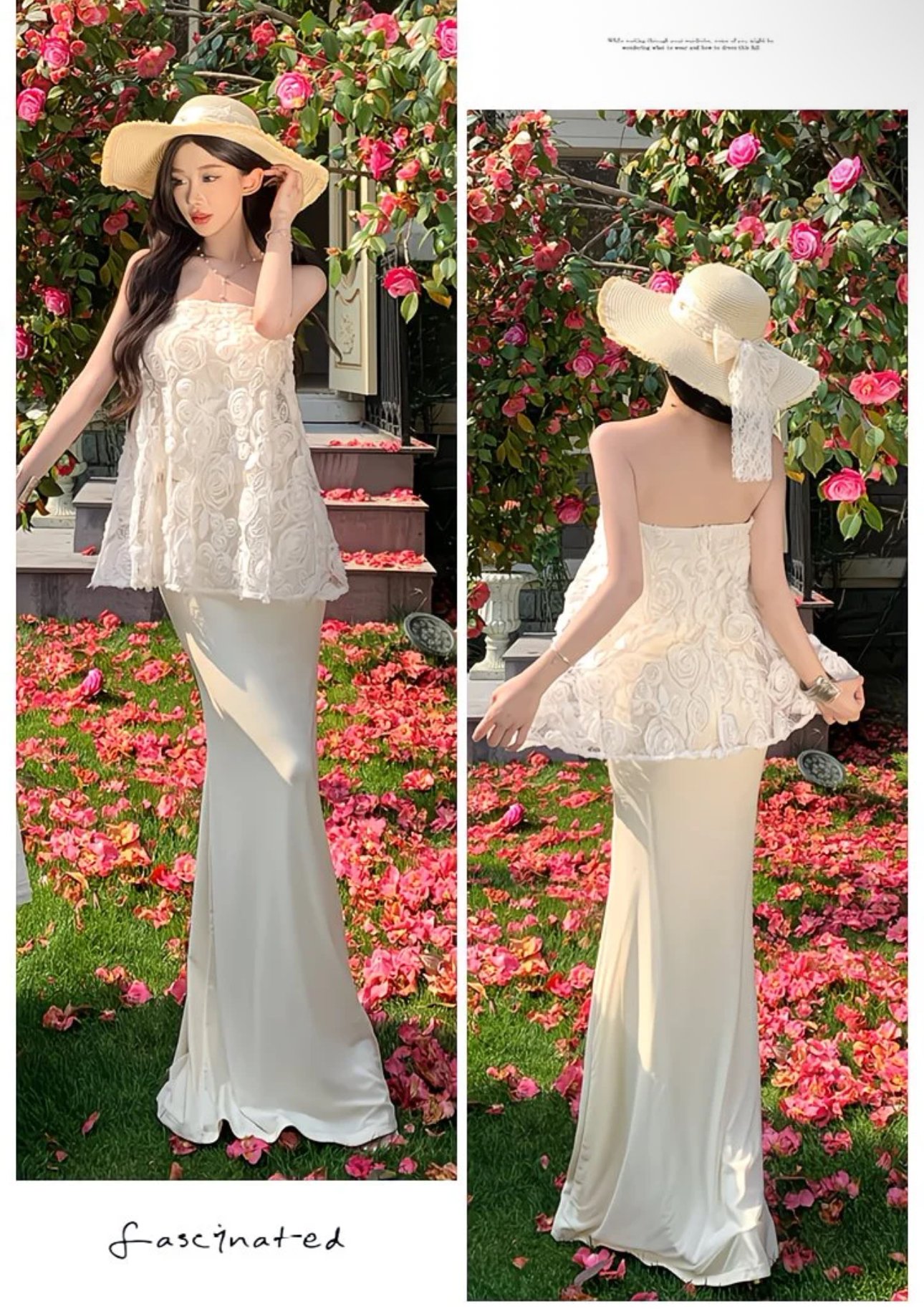 A romantic two-piece ensemble made for sunlit strolls and soft moments. The strapless ivory lace peplum top blooms with delicate rosette embroidery, creating a gentle, airy silhouette that floats with every step. Paired with a sleek, floor-skimming skirt, the set balances graceful structure with effortless femininity. Perfect for garden parties, destination soirées, or any day you want to feel quietly enchanting among the flowers. 🌸