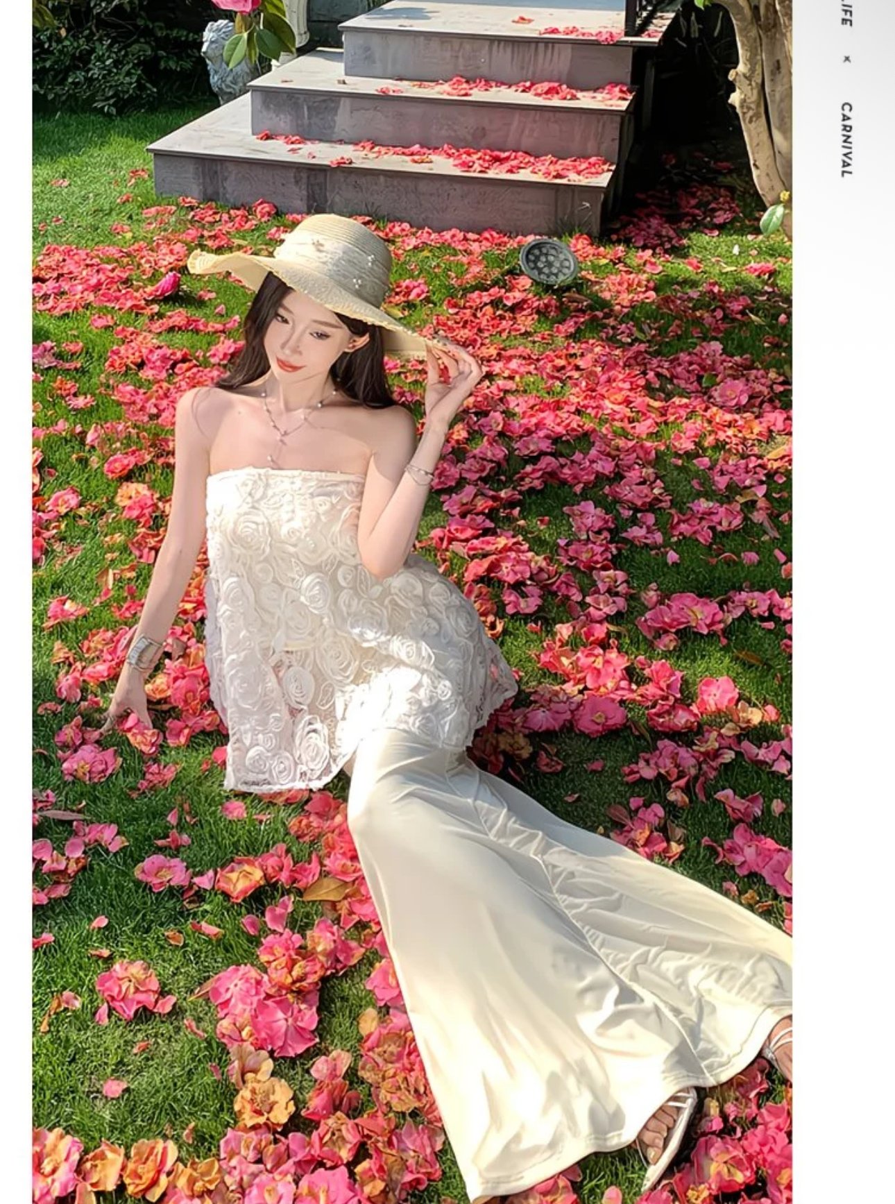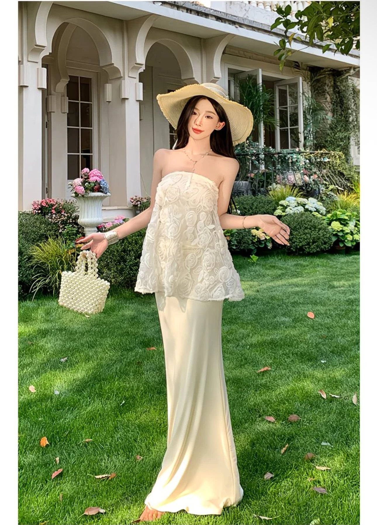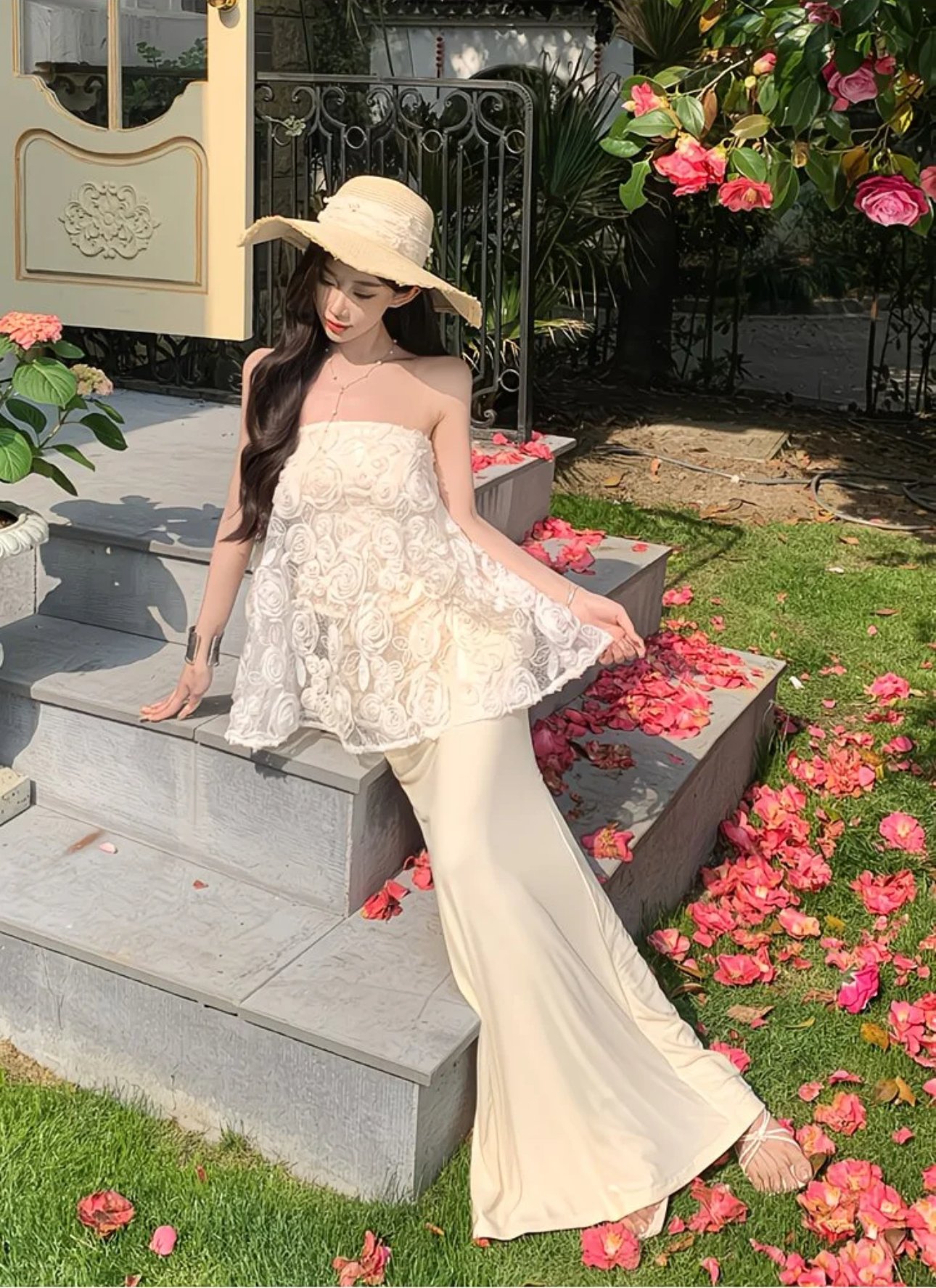 A romantic two-piece ensemble made for sunlit strolls and soft moments. The strapless ivory lace peplum top blooms with delicate rosette embroidery, creating a gentle, airy silhouette that floats with every step. Paired with a sleek, floor-skimming skirt, the set balances graceful structure with effortless femininity. Perfect for garden parties, destination soirées, or any day you want to feel quietly enchanting among the flowers. 🌸
