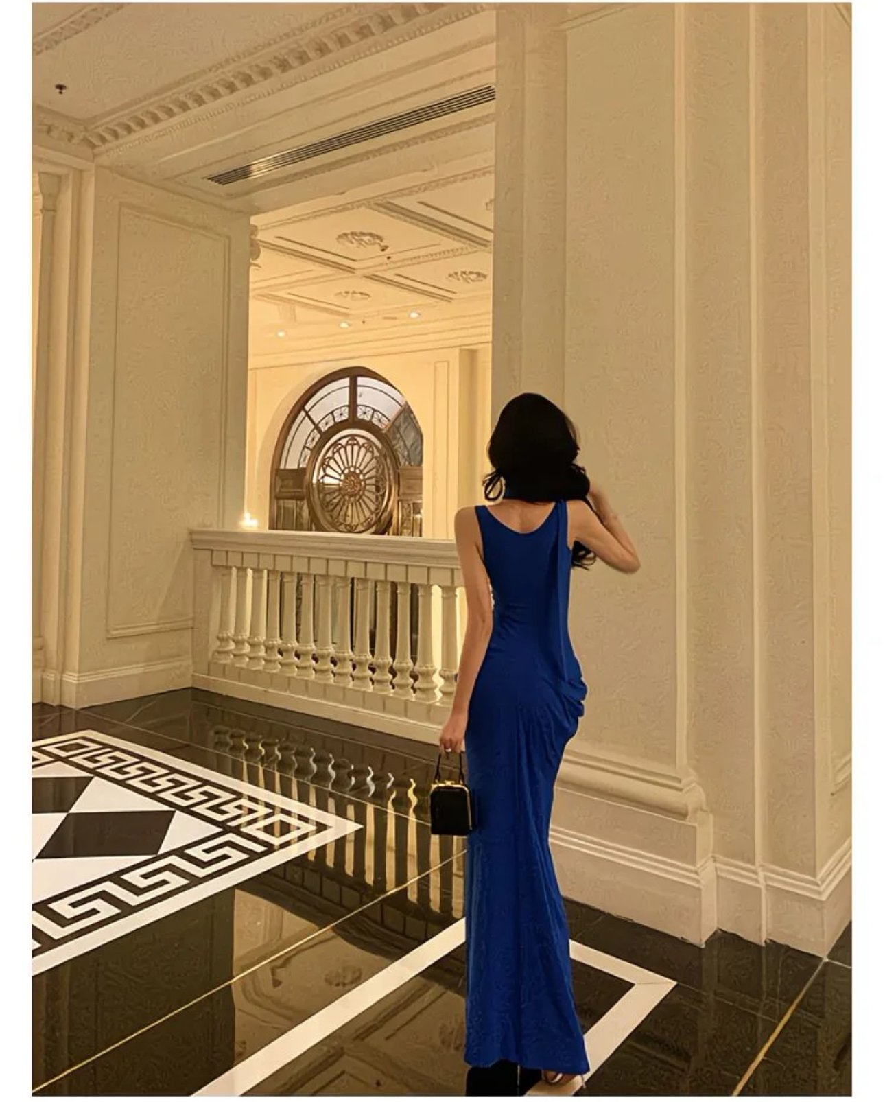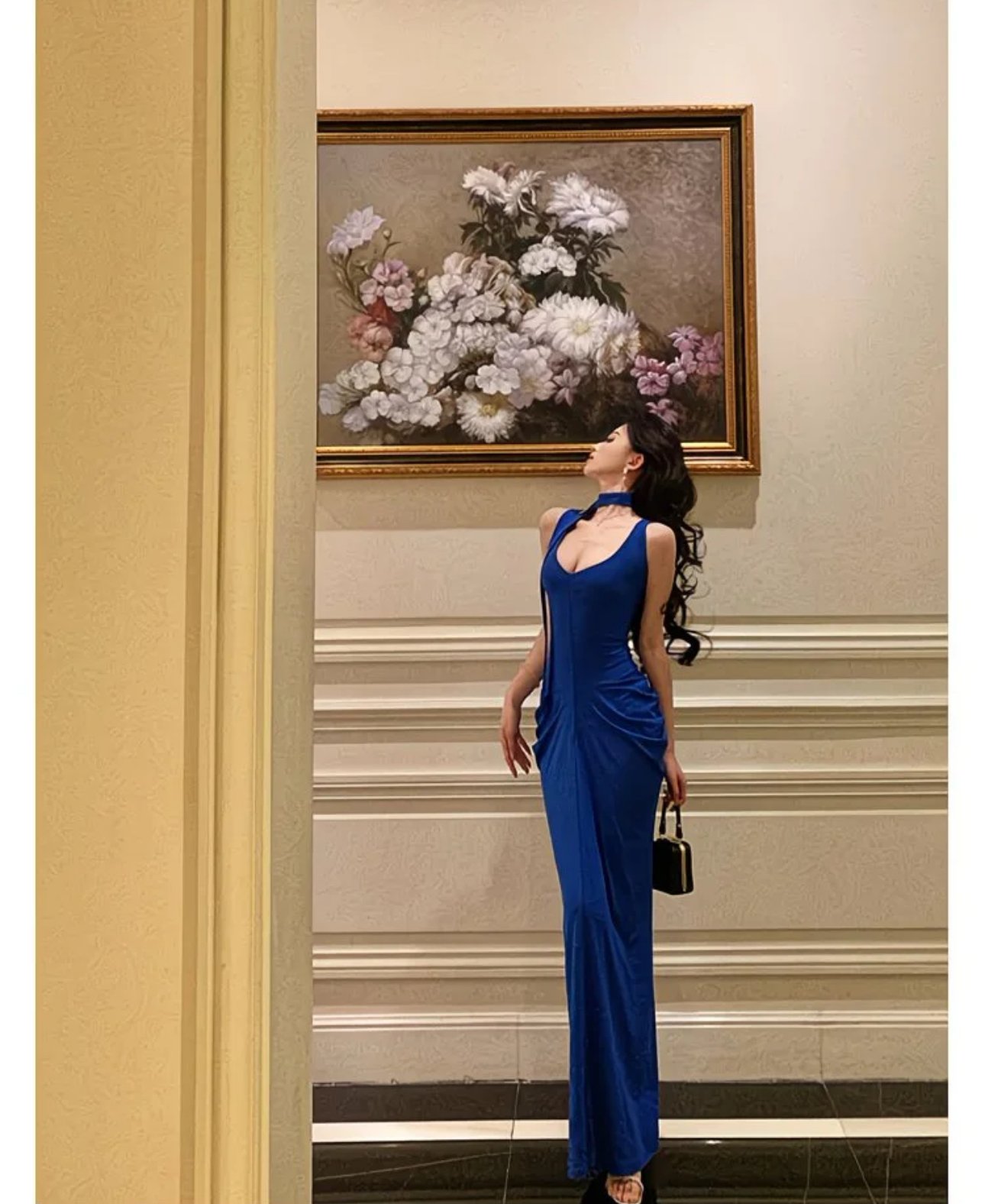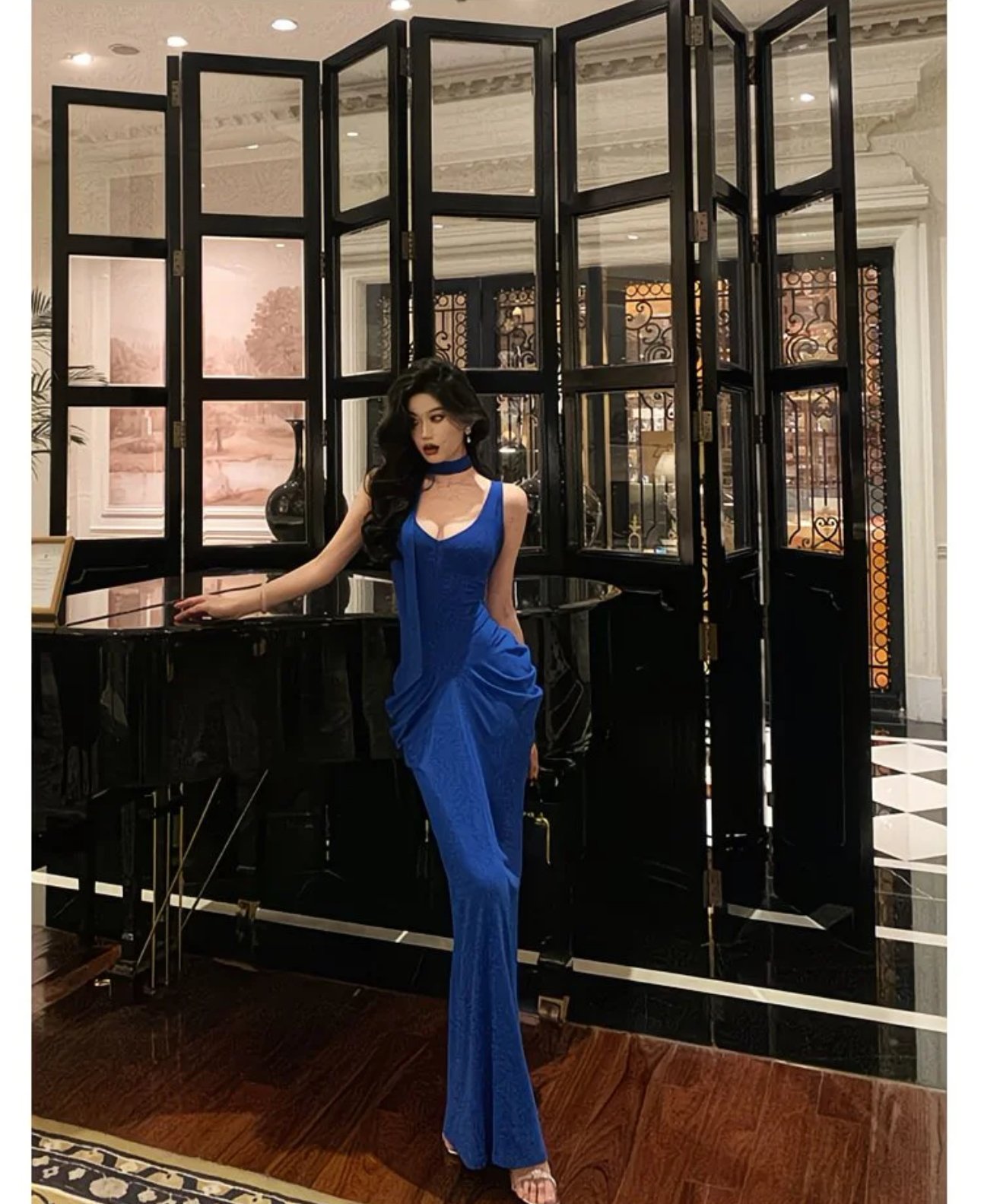Draped in a rich sapphire-blue silhouette, this gown flows with effortless drama and quiet confidence. The plunging neckline and sculpted ruching accentuate the form, while the choker detail adds a modern edge to classic elegance. Finished with soft waves and minimal accessories, the look captures a refined, after-dark allure—bold, graceful, unforgettable.