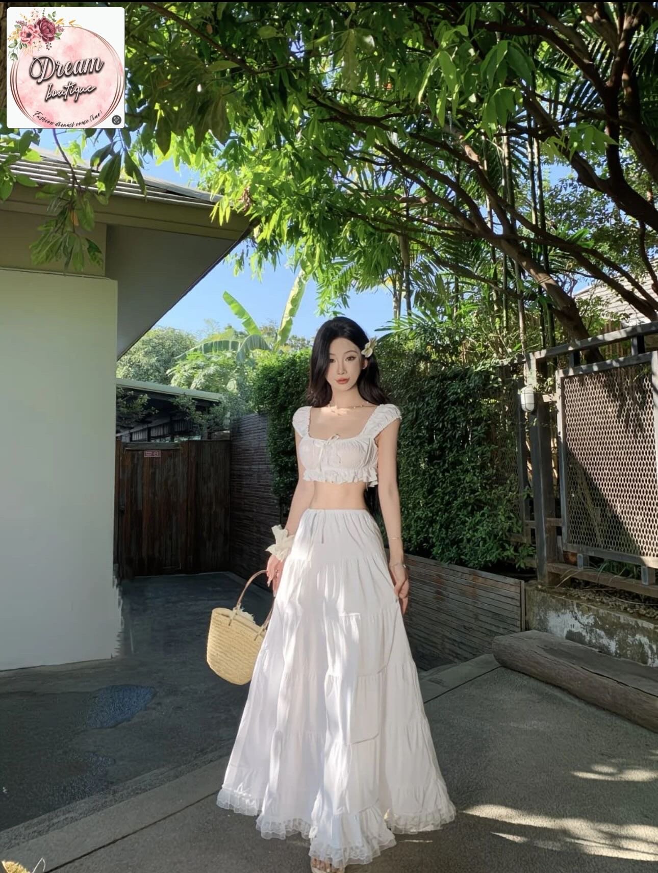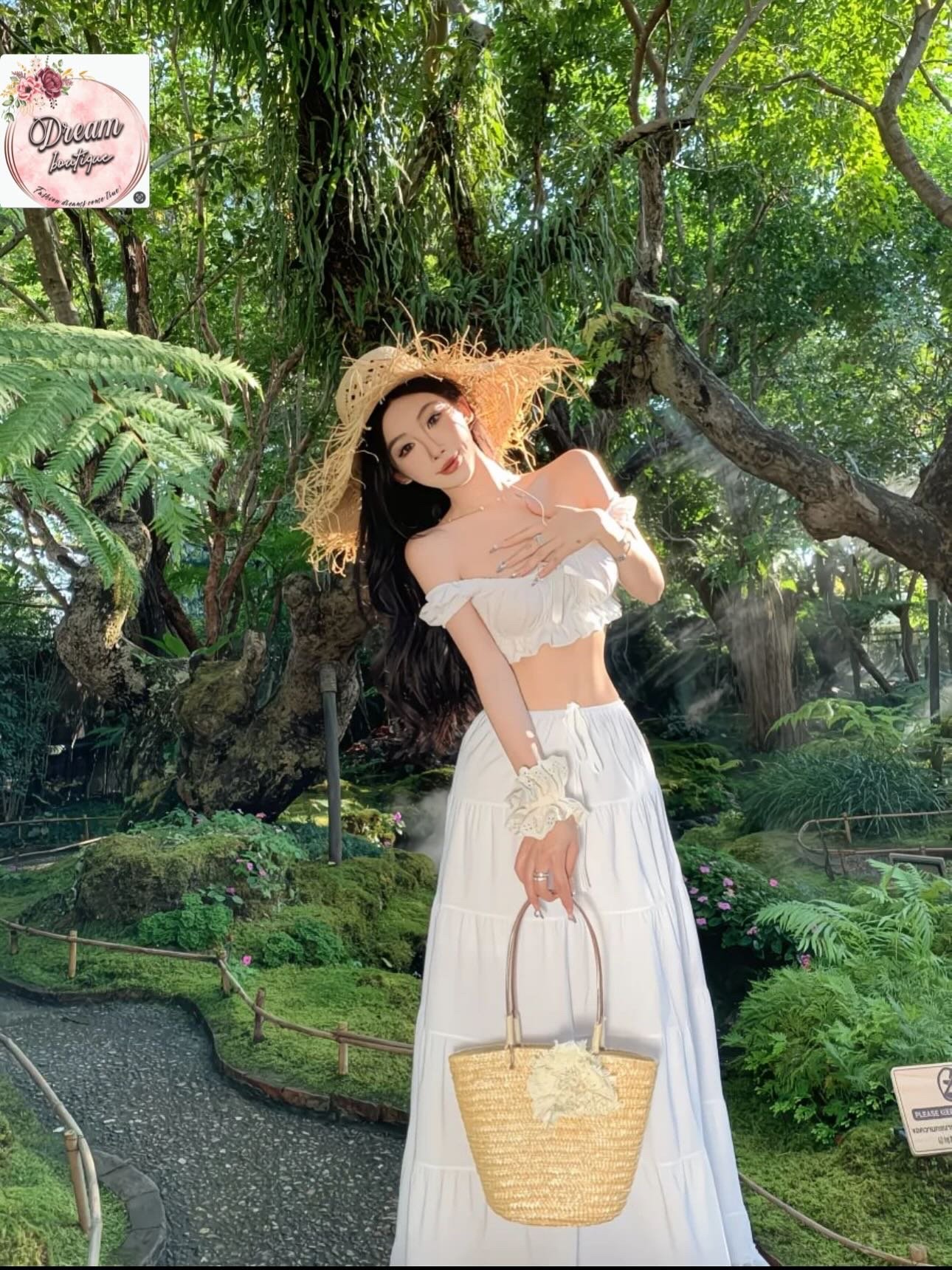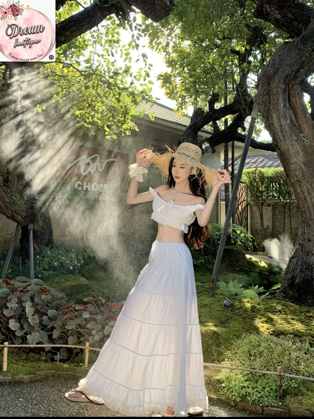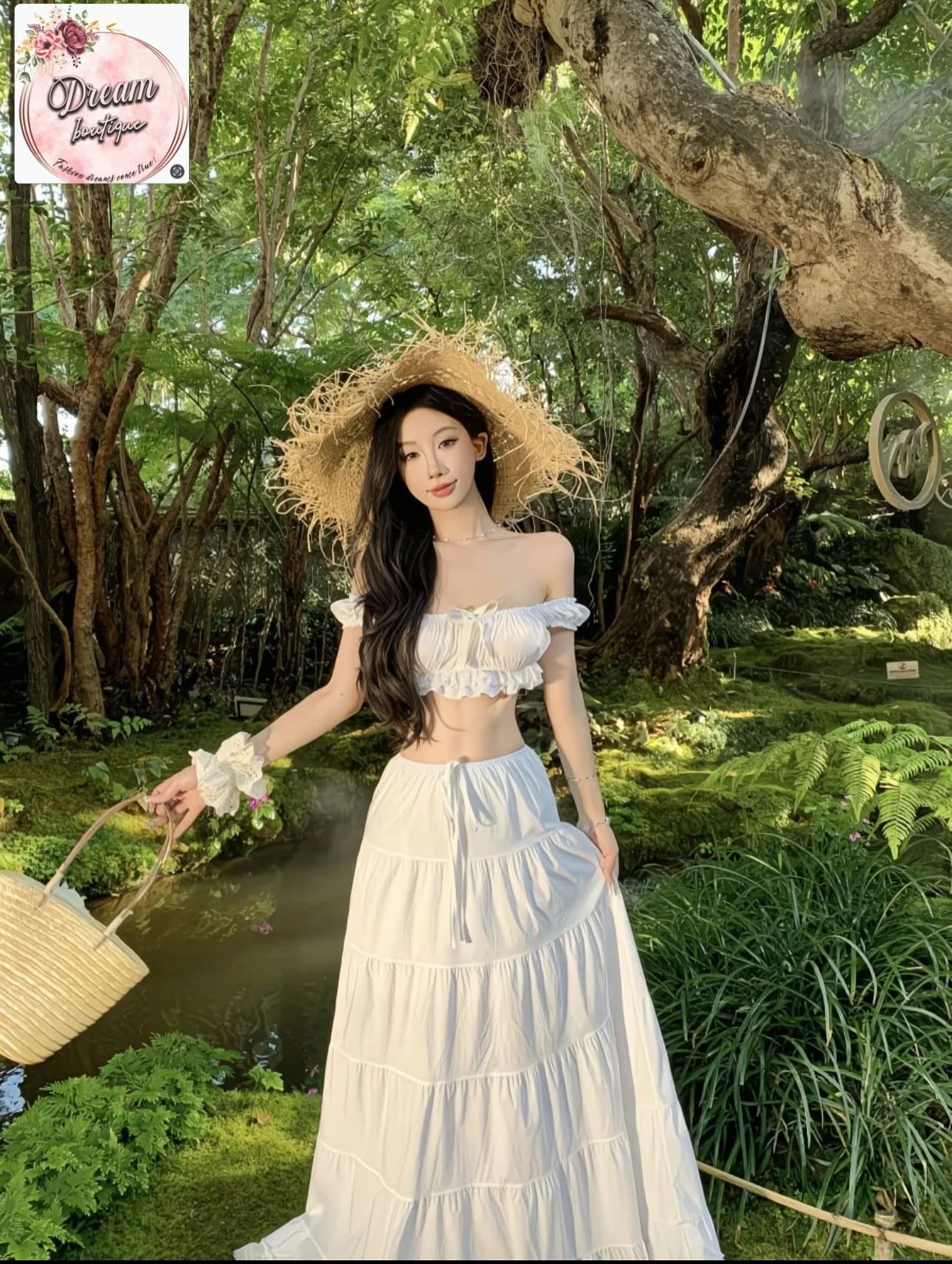 Draped in soft white and crowned with a straw hat, she stands quietly embraced by nature’s lush greens. Sunlight filters through ancient trees, catching the gentle flow of her skirt and the calm elegance of the moment. A scene where grace meets the wild—peaceful, feminine, and effortlessly timeless.